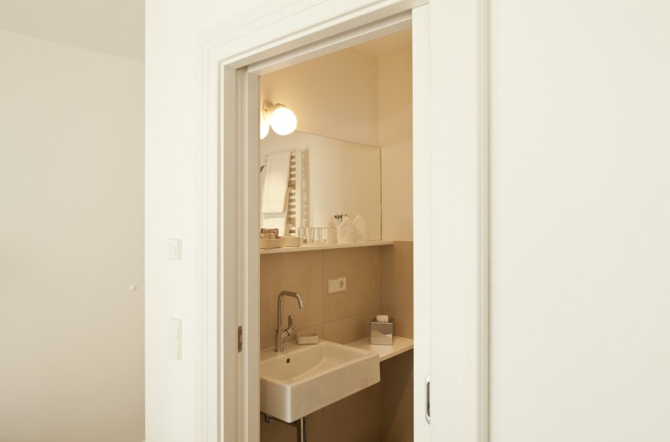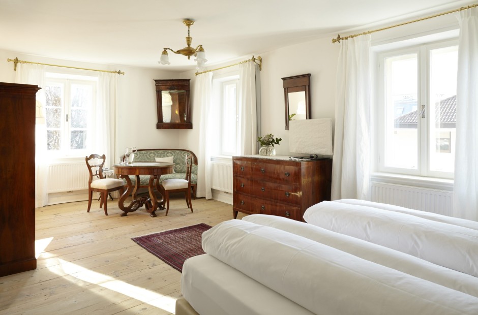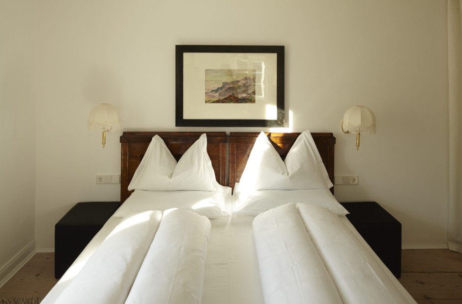 Cette chambre ensoleillée est idéale pour les amoureux du style Biedermeier. L’hôte est transporté à une autre époque. Située à l’angle de la maison, cette chambre resplendit de lumière lorsque le soleil donne sur le bois de l’ancien parquet.