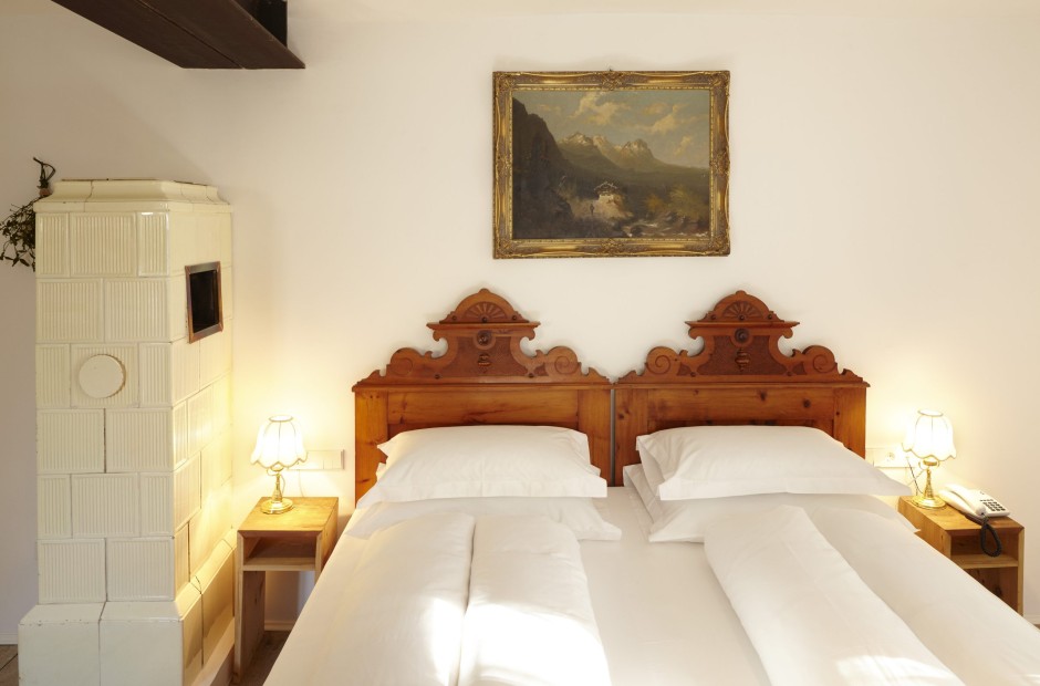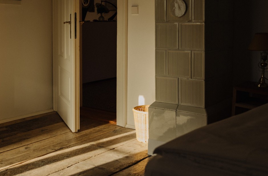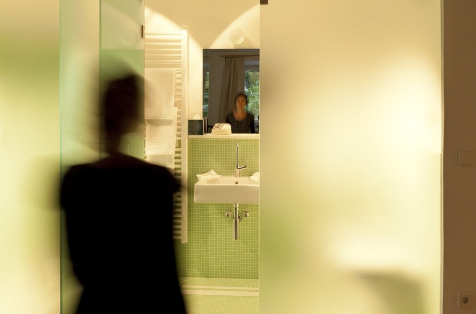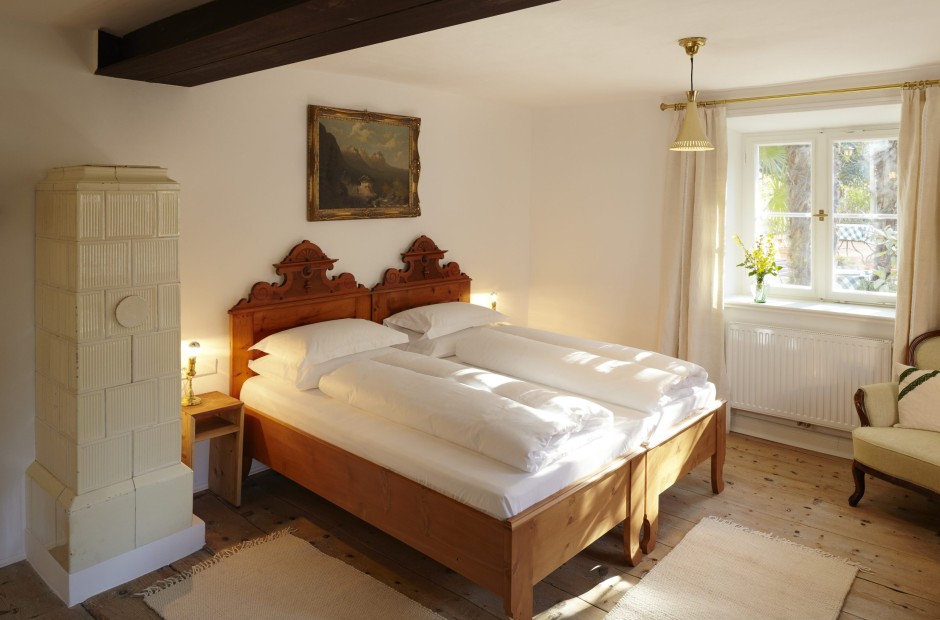 Le beau plancher pourrait sans doute conter maintes petites anecdotes sur les hôtes de la maison qui séjournèrent jadis dans les deux chambrettes. Les lignes épurées de la salle de bain créent un contraste esthétique avec cette atmosphère du passé. Cette chambre est idéale pour les hôtes qui souhaitent habiter au rez-de-chaussée.
