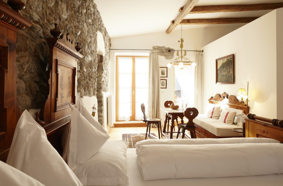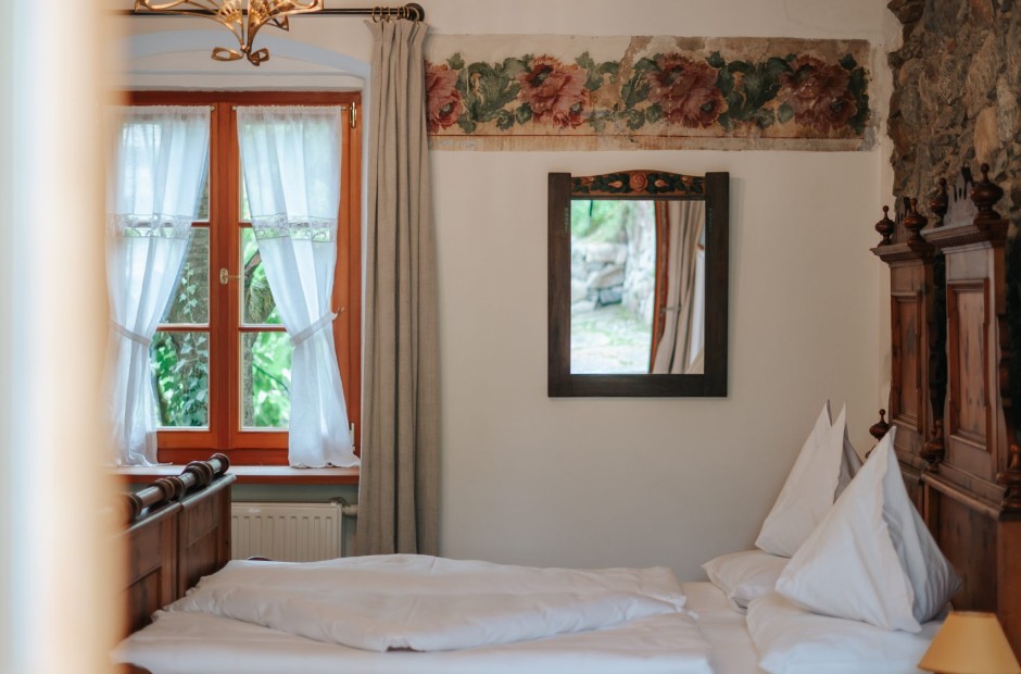 Une chambre de caractère au mur de pierre, avec sa frise Art nouveau et son propre petit jardin accédant directement au vignoble et au jardin de la propriété. Le mobilier ancien en bois de pin des Alpes respire la robustesse et le confort. Au siècle dernier, les deux soubrettes Mitzi et Martha très courtisées par les hôtes du domaine dormaient dans cette chambre.
