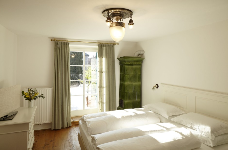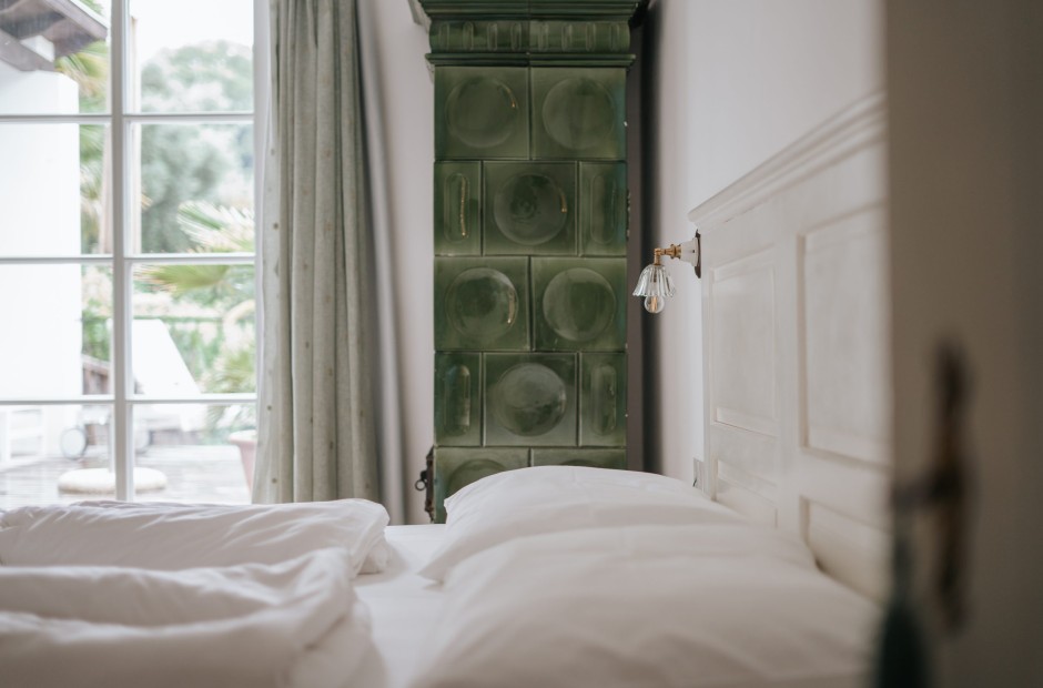 La chambre orientée vers le sud donne sur la palmeraie. La terrasse s’ouvre sur la nature et offre le privilège d’un îlot de soleil avec ses propres chaises longues. Le poêle en faïence vert que l’on peut allumer, les meubles en rotin dans un style campagnard et une armoire murale intégrée confèrent à la chambre son caractère sobre et calme.