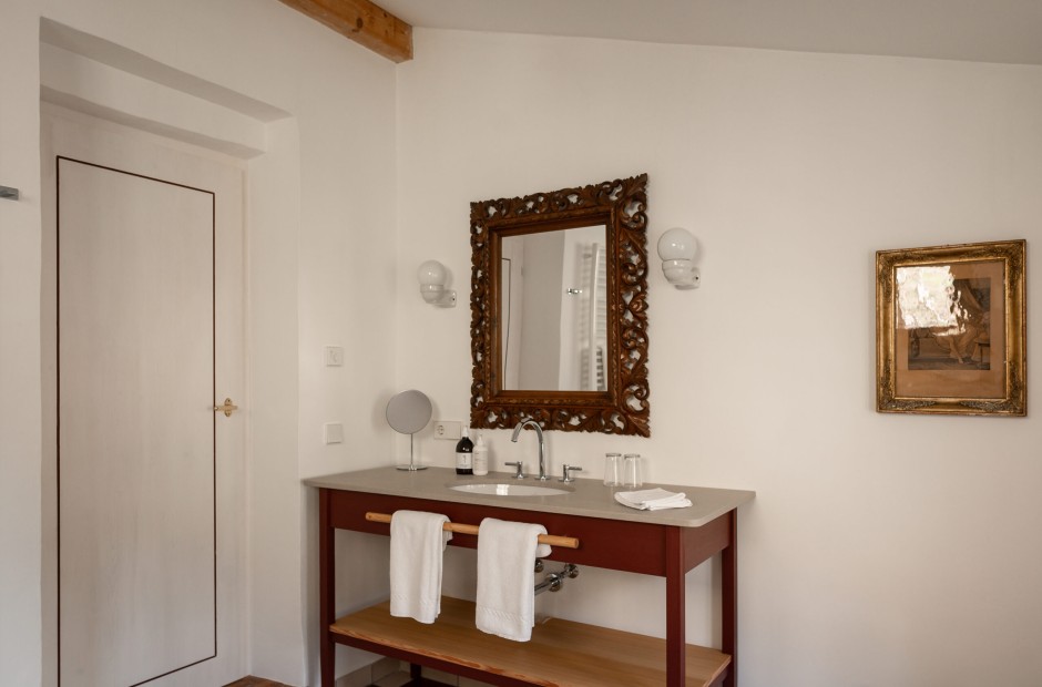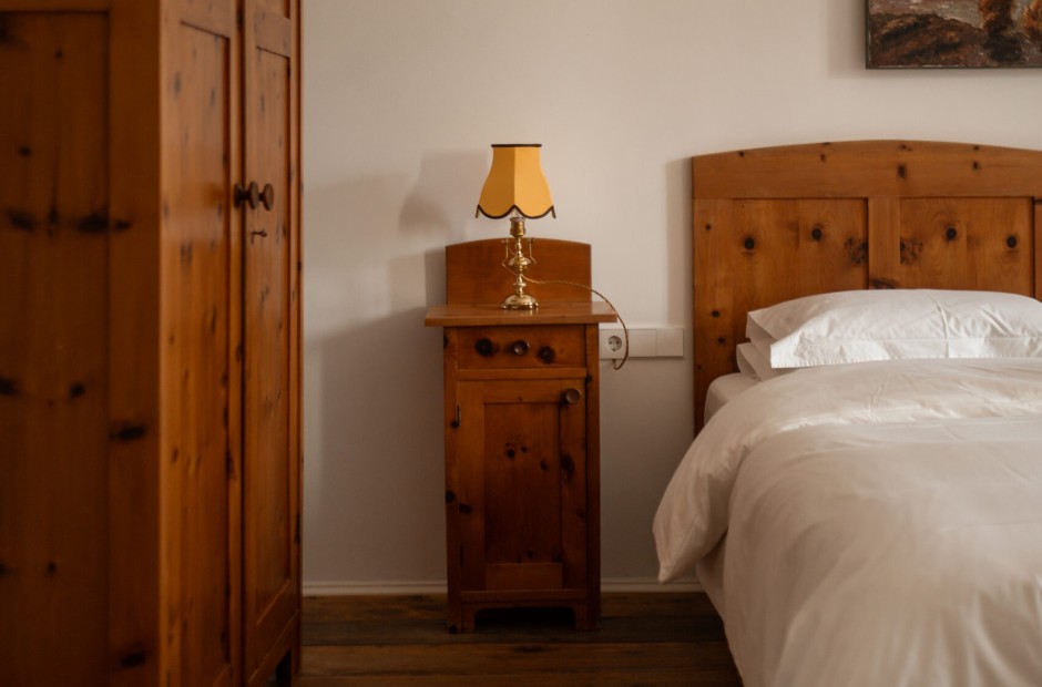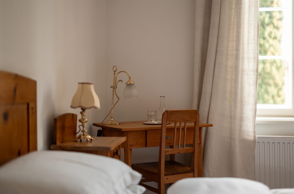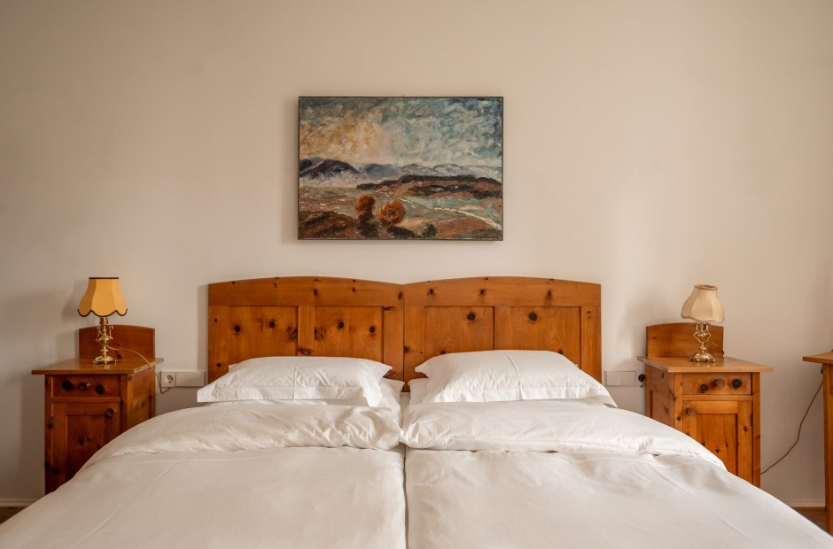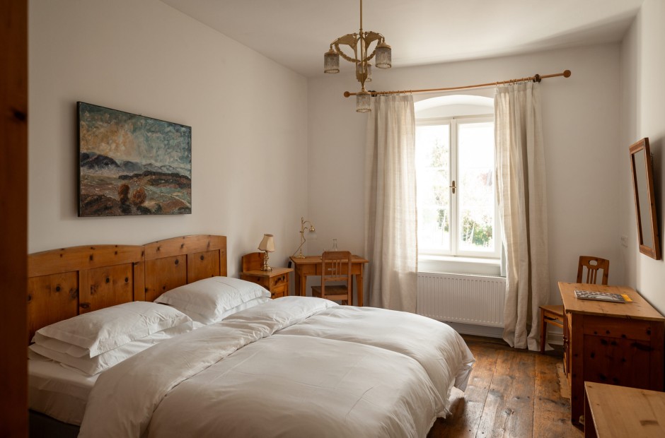 La camera nella torre – è una camera con vista sul paesaggio magnifico di Merano: verso sud, ma anche verso la nostra collina anord e persino verso i pendii del vigneto a est. L’accento è sul legno, con mobili degli anni Trenta in cirmolo e pavimento a listoni. Una deliziosa piccola biblioteca conduce alla Turmzimmer.