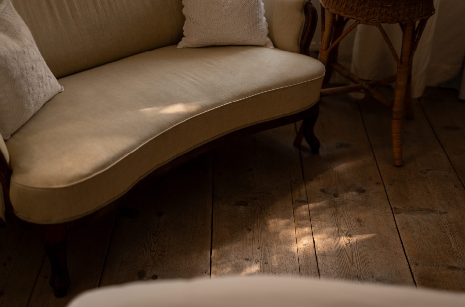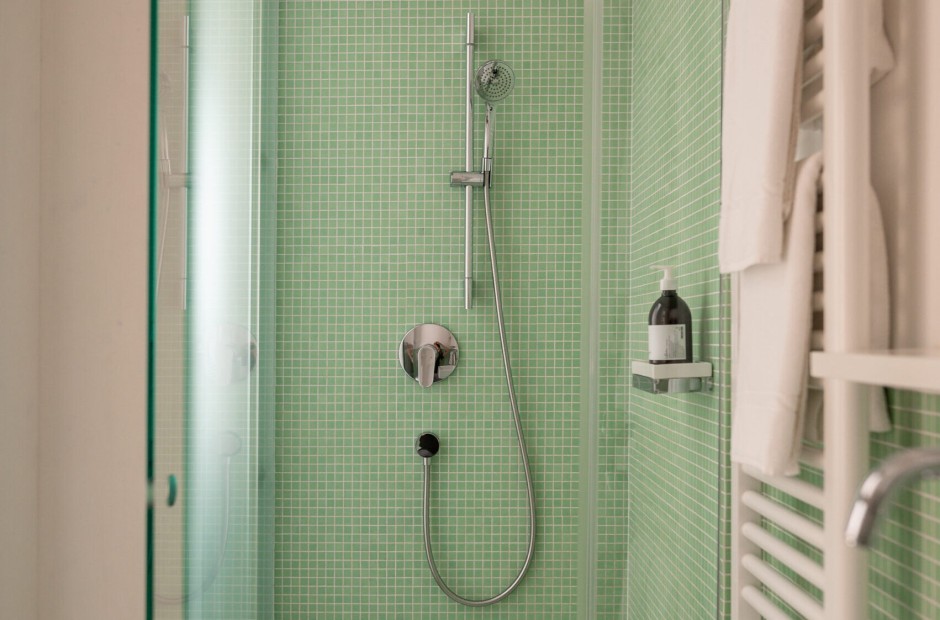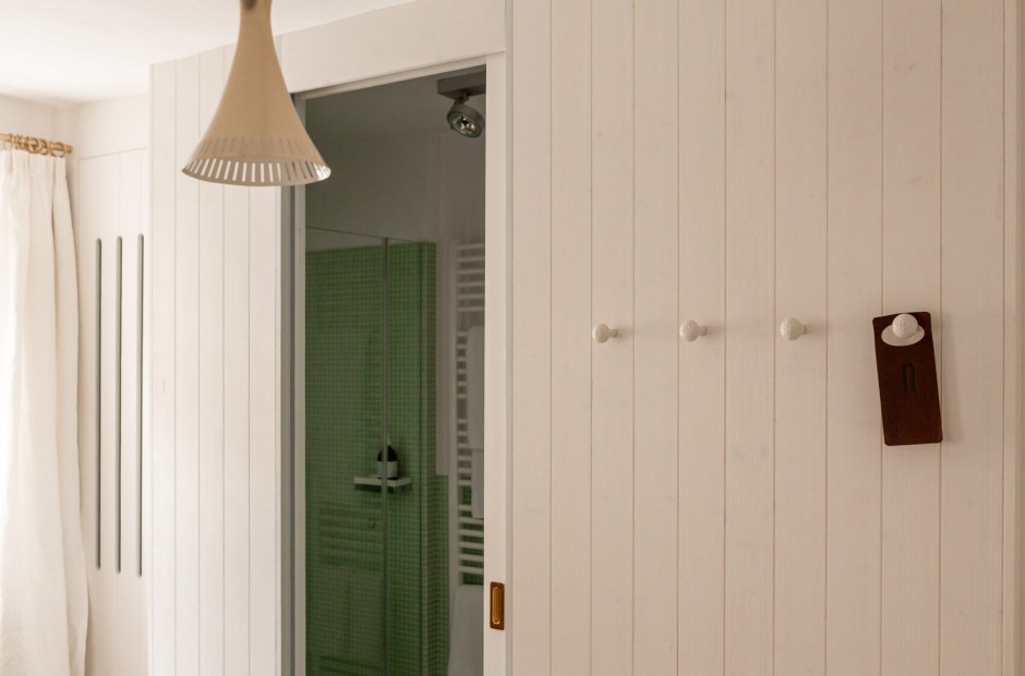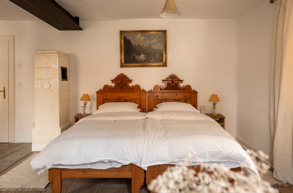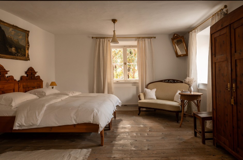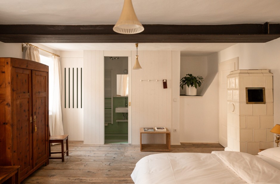 Der alte Holzboden in diesem Zimmer könnte viele Geschichten von den Besuchern des Hauses erzählen die einst in den zwei Stubenzimmern einkehrten. Das Zimmer bezieht seinen Reiz aus dem Zusammenspiel der archaischen Kraft des Bodens und den klaren Linien des Bades. Dieses Zimmer eignet sich insbesondere für Gäste, die ebenerdig wohnen möchten.